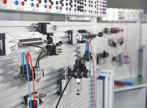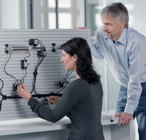Los sistemas de entrenamiento neumático de Rexroth consisten en estaciones de trabajo modulares con los equipos correspondientes donde los componentes estándar de la industria se utilizan con el sistema de montaje rápido «Snap-In».
